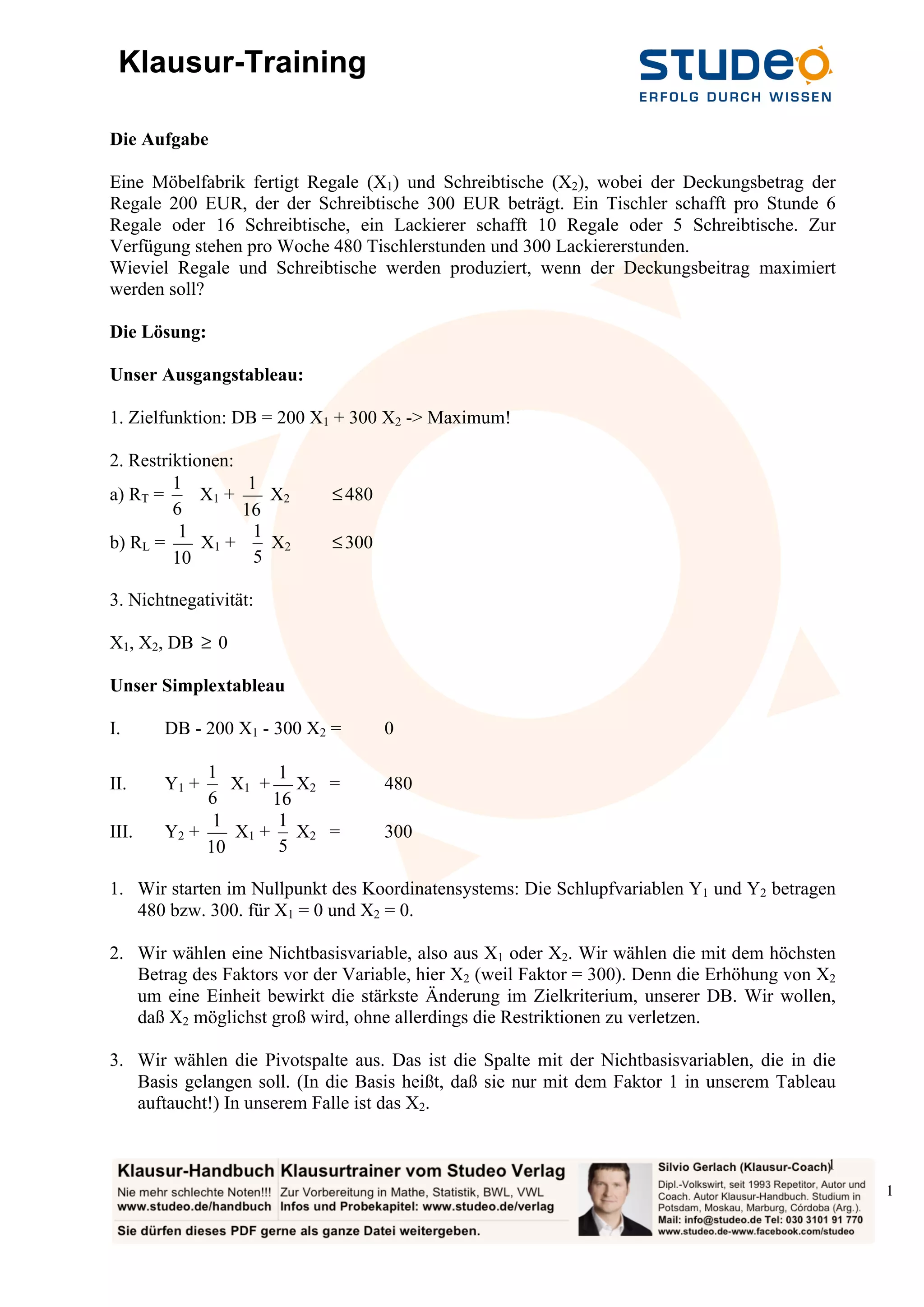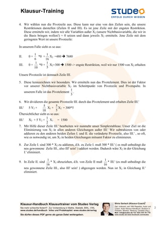 Das Dokument behandelt ein Optimierungsproblem einer Möbelproduktion, bei dem es darum geht, Regale und Schreibtische herzustellen, um den Deckungsbeitrag zu maximieren. Mithilfe der Simplexmethode werden die relevanten mathematischen Schritte zur Identifikation der optimalen Produktionsmenge für Regale (x1) und Schreibtische (x2) beschrieben, wobei das maximale Ergebnis bei einem Deckungsbeitrag von 592,615 EUR erzielt wird. Letztendlich wurden die optimalen Produktionszahlen als 2852,3 Regale und 73,85 Schreibtische ermittelt.