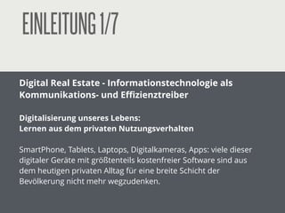 Die Studie zur digitalen Strategie in der Immobilienwirtschaft zeigt, dass die Branche sich langsamer digitalisiert als andere, obwohl digitale Technologien und Social Media zunehmend wichtig für Effizienzsteigerungen werden. Innovative Ansätze, wie die Nutzung von Big Data, Smart Data, Crowdfunding und digitalen Marketingmethoden, sind notwendig, um wettbewerbsfähig zu bleiben. Außerdem wird auf die Bedeutung neuer Technologien und Hardware wie Smartphones und Virtual Reality für die Veränderung der Immobilienvermittlung hingewiesen.