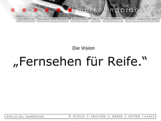 Das Dokument beschreibt die Entwicklung eines Free-TV-Senders in Deutschland, der speziell auf die Zielgruppe der über 50-Jährigen zugeschnitten ist, um deren Bedürfnisse zu bedienen und die hohe Kaufkraft dieser Generation zu nutzen. Der Sender plant ein vielfältiges Programm, das von Nachrichten über Dokumentationen bis hin zu Spielfilmen reicht, und strebt an, innerhalb des ersten Jahres einen Marktanteil von 15 % in dieser Zielgruppe zu erreichen. Um die Bekanntheit der Marke zu steigern, werden vor allem 'above-the-line' Werbemethoden und Kooperationen mit der Seniorenindustrie empfohlen.