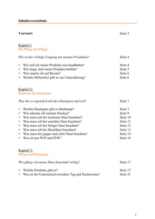 Das Dokument bietet eine umfassende Anleitung zur Hautpflege, von der richtigen Handhabung von Produkten bis hin zu den verschiedenen Hauttypen und deren spezifischen Bedürfnissen. Es beinhaltet wichtige Tipps zur Hygiene, Produktlagerung und Haltbarkeit sowie Informationen über dekorative Kosmetik und Farbberatung. Ziel ist es, Leser über die Bedeutung der Hautpflege zu informieren und ihnen zu helfen, ihre individuellen Hautbedürfnisse besser zu verstehen.