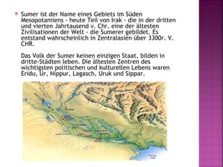 Sumer war ein Gebiet im Süden Mesopotamiens, das zwischen dem 3. und 4. Jahrtausend v. Chr. eine der ältesten Zivilisationen der Welt bildete, bekannt für Städte wie Ur und Uruk sowie ihre bedeutenden kulturellen und technologischen Fortschritte. Die sumerische Zivilisation trug zur Entwicklung der Keilschrift, im Bereich der Landwirtschaft, im Handwerk, und in der Rechtsordnung bei, wobei sie auch religiöse Überzeugungen und Gesetze hervorbrachte, die humaner waren als einige spätere Systeme. Das Verschwinden der Sumerer bleibt ein Rätsel, da es schwer zu glauben ist, dass eine so fortschrittliche Kultur einfach verschwand.