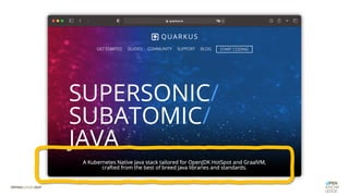 Das Dokument behandelt die Herausforderungen und Möglichkeiten von Enterprise Java in Cloud-Umgebungen, insbesondere im Hinblick auf Microservices und schnelle Entwicklungszyklen. Es wird der Quarkus-Ansatz vorgestellt, der darauf abzielt, die Größe und Startzeit von Anwendungen zu optimieren, während er gleichzeitig die Verwendung von Standards und Integration von Proprietären APIs ermöglicht. Der Fokus liegt auf der Verbesserung der Performance und Effizienz durch Techniken wie Ahead-of-Time Compilation und Build-Time Optimierung.