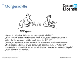 Das Dokument behandelt die Optimierung von SAP-Lizenzmanagement, einschließlich der Stilllegung, des Kaufens und Verkaufs von Lizenzen. Es werden Herausforderungen wie hohe Wartungskosten und Änderungen in Lizenzregeln angesprochen, während die Vorteile von Cloud-Lösungen und die Möglichkeit zur Lizenzweitergabe hervorgehoben werden. Zudem werden Strategien zur Verbesserung der Markttransparenz und zur Kostenreduktion vorgestellt.