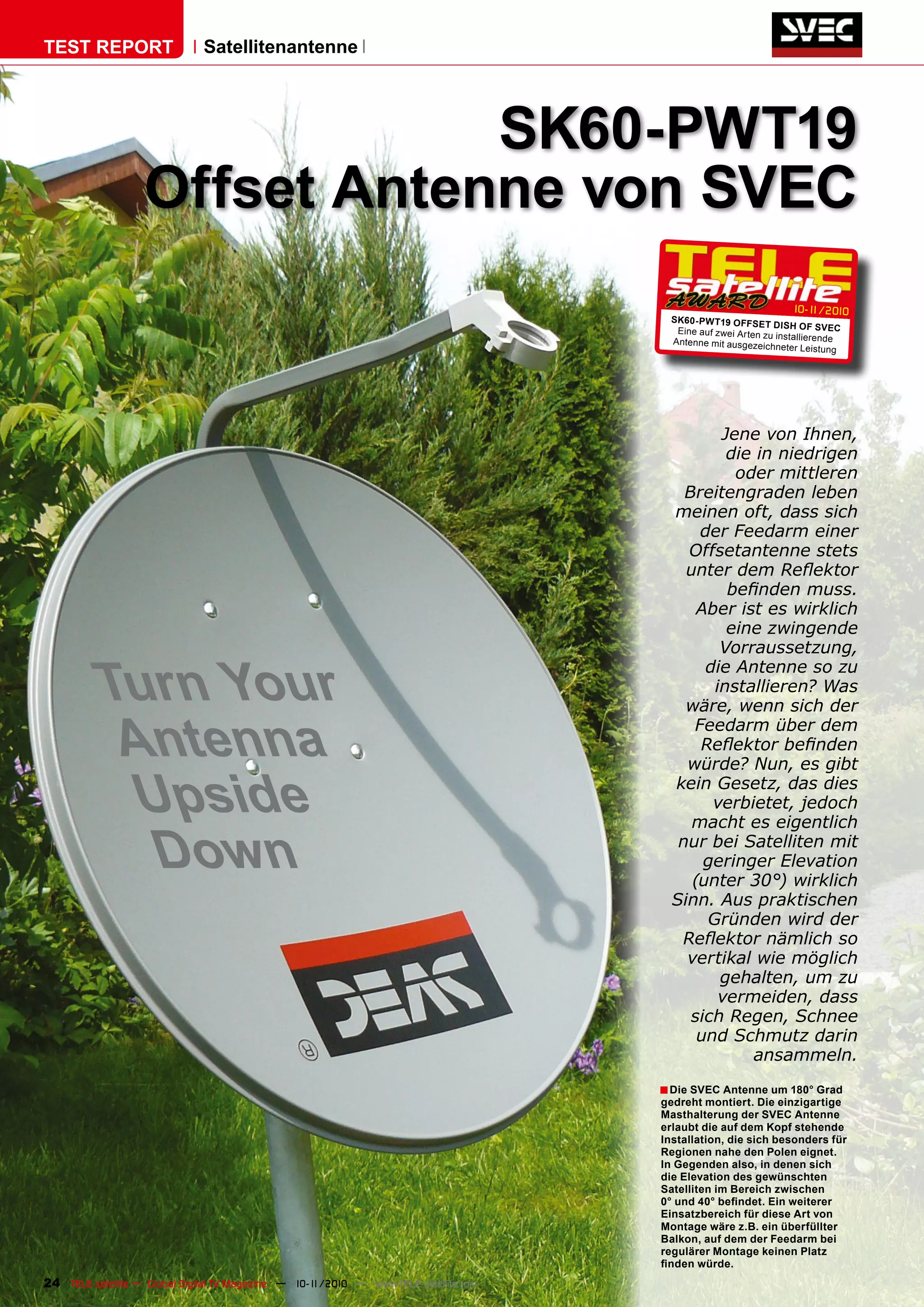 Der Testbericht zur svec SK60-PWT19 Offset-Antenne beschreibt ihre Vielseitigkeit und die Möglichkeit, sie auf zwei verschiedene Arten zu installieren, um optimale Signalempfangsbedingungen zu gewährleisten, insbesondere in Regionen mit niedrigerer Satelliten-Elevation. Der Bericht hebt die hohe Verarbeitungsqualität und den exzellenten Signalgewinn der Antenne hervor, die sich durch eine spezielle Beschichtung auszeichnet, die ihre Langlebigkeit erhöht. Die Antenne wird mit einem gebogenen Montage-Mast angeboten, der flexible Installationsmöglichkeiten bietet.