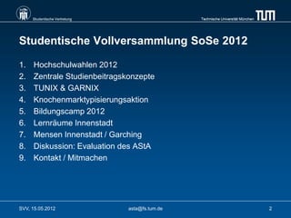 Das Dokument informiert über verschiedene Aktivitäten und Themen der studentischen Vertretung an der Technischen Universität München, darunter Hochschulwahlen, Studienbeitragskonzepte, Bildungsbiwak und Angebote zur Knochenmarktypisierung. Es werden Details zu Wahlterminen, Wahlverfahren und den Funktionen der studentischen Gremien vorgestellt. Zudem werden Informationen zu studentischen Veranstaltungen, Lernräumen und einer Initiative zur Bekämpfung von Leukämie gegeben.