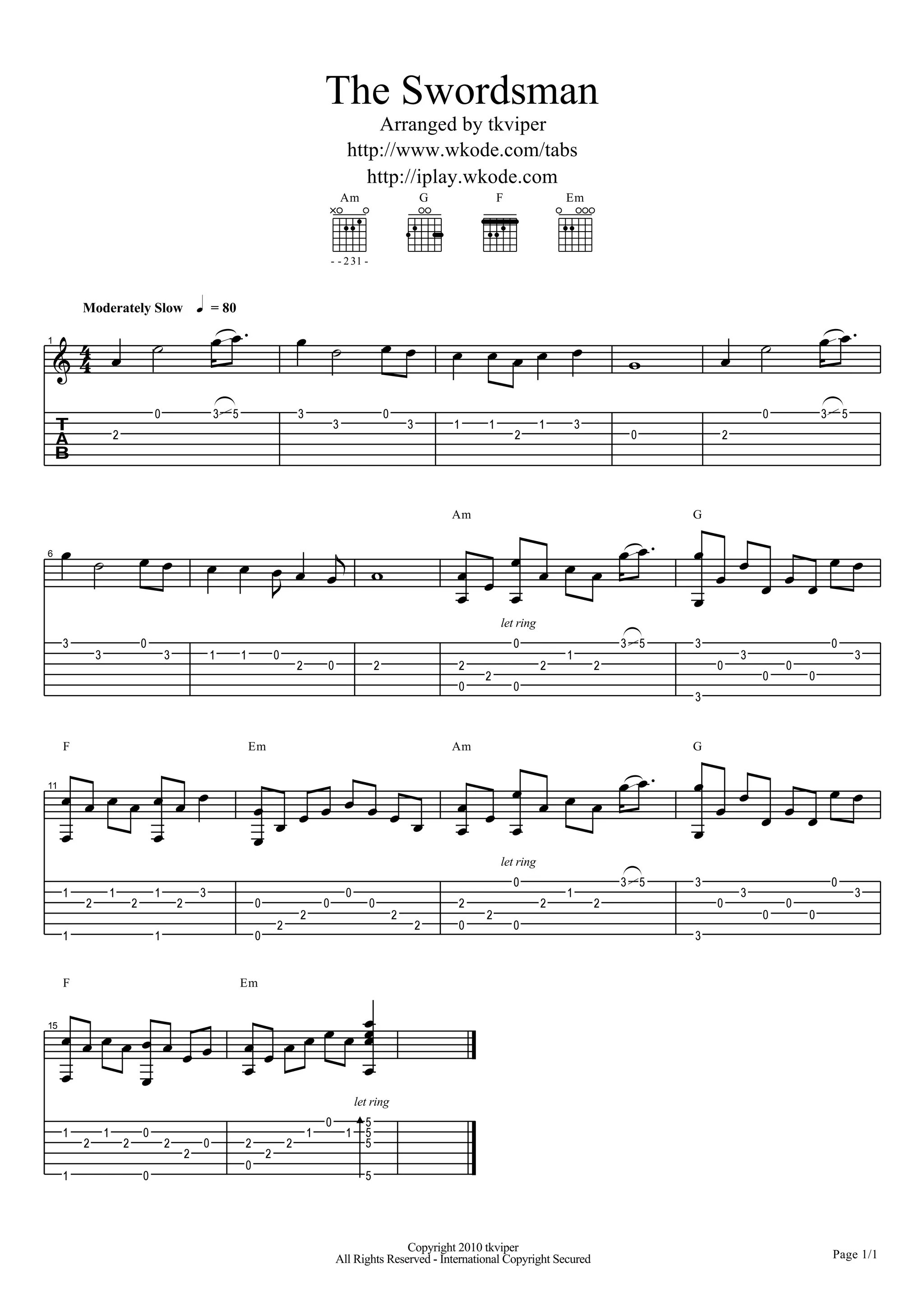 Das Dokument enthält eine musikalische Anordnung namens 'the swordsman', die von tkviper erstellt wurde. Es beschreibt die notierten musikalischen Abschnitte, die im langsamen Tempo und im 4/4-Takt gespielt werden sollen. Das Dokument endet mit einem Hinweis auf das Urheberrecht von 2010, das alle internationalen Rechte sichert.