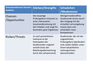 Das Dokument befasst sich mit den Stärken und Schwächen von Psychologiestudenten in verschiedenen Forschungsbereichen und deren Auswirkungen auf die Lebensqualität. Es werden Chancen und Risiken aufgezeigt, die durch die Art der Forschung, Teilnahmebedingungen und persönliche Interessen entstehen. Zudem wird die Rolle neuer Prüfungsformen und deren Einfluss auf die Motivation und Ergebnisse der Studierenden thematisiert.