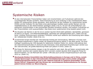 Im Oktober 2018 zeigen die systemischen Risikoindikatoren eine Stabilität im europäischen Bankensektor und eine erhöhte Volatilität an den Finanzmärkten aufgrund internationaler Unsicherheiten, ohne dass eine akute systemische Krise droht. Während die Verschuldung in den USA und China Besorgnis erregt, steigen die Immobilienpreise in der EU weiterhin stark, was potenzielle Risiken birgt. Trotz wachsender wirtschaftlicher und handelspolitischer Spannungen gibt es im Hinblick auf die Risikoindikatoren in Europa jedoch keinen unmittelbaren Anlass zur Sorge.