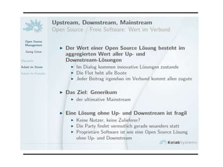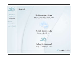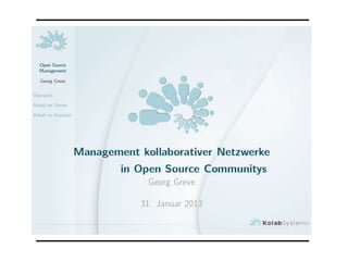 Das Dokument beschreibt ein Event zur Diskussion über das Management kollaborativer Netzwerke in Open Source Communities, das am 31. Januar 2013 von Georg Greve veranstaltet wird. Es beinhaltet fünf Tagesthemen mit 19 Referaten, Chats und Webinaren, die sich auf Herausforderungen und Perspektiven des Open Managements konzentrieren. Alle Aktivitäten sind kostenlos und weitere Informationen sind auf www.netbaes.net verfügbar.
