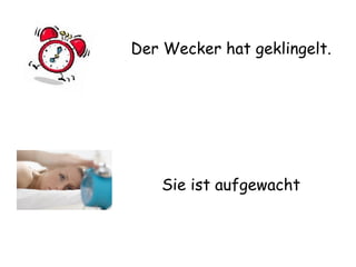 Das Dokument beschreibt den täglichen Ablauf von zwei Personen, die morgens aufstehen, sich für den Tag vorbereiten und zur Schule gehen. Nach der Schule essen sie zu Mittag, machen Hausaufgaben, spielen Fußball und entspannen sich am Computer oder mit einem Buch. Am Ende des Tages gehen sie schlafen.
