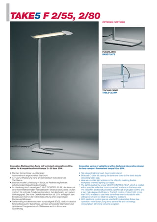Die innovative Stehleuchten-Serie take5 ist für zwei oder vier kompaktleuchtstofflampen ausgelegt und bietet eine elegante, flache Bauweise mit asymmetrischem Standrohr. Sie ermöglicht eine flexible Arbeitsplatzbeleuchtung und verwendet einen speziellen 'light control film', um eine optimale Lichtverteilung und Blendfreiheit zu gewährleisten. Diese Leuchten sind mit elektronischen Vorschaltgeräten ausgestattet und bieten hohe Energieeffizienz sowie die Möglichkeit zur Dimmung.