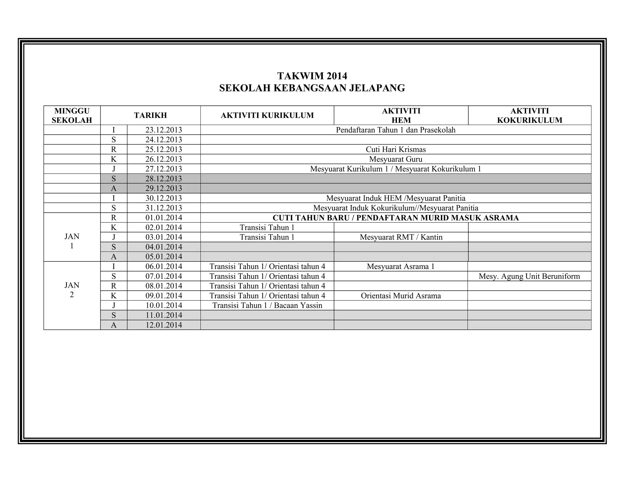 Das Dokument beschreibt den Schuljahresplan für die Grundschule Jelapang für das Jahr 2014, einschließlich der Aktivitäten, Termine und Meetings vom 1. Januar bis zum 31. Dezember. Es enthält Informationen über verschiedene Schulaktivitäten, kulturelle Feiertage und regelmäßige Meetings der Lehrkräfte sowie spezielle Programme im Laufe des Jahres. Der Plan ist detailliert und umfasst eine Vielzahl von Veranstaltungen zur Förderung der Schülerbeteiligung und -entwicklung.
