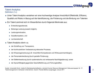 Das Dokument behandelt Talent Analytics als eine wertvolle Methode zur Analyse von Bewerber- und Mitarbeiterdaten, um Talente effektiv zu identifizieren, zu fördern und zu binden. Es wird betont, dass Unternehmen, die fortgeschrittene Analysemethoden nutzen, ihre Produktivität und Mitarbeiterbindung steigern können, was letztendlich zu einem Wettbewerbsvorteil führt. Zudem wird die Bedeutung evidenzbasierter Managementansätze hervorgehoben, um fundierte Entscheidungen im Talentmanagement zu treffen.