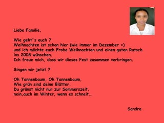 Sandra wünscht ihrer Familie frohe Weihnachten und einen guten Rutsch ins Jahr 2008. Sie freut sich darauf, das Fest gemeinsam zu verbringen und schlägt vor, ein Weihnachtslied zu singen. Die Botschaft ist sowohl auf Deutsch als auch auf Spanisch verfasst.