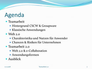 Die Präsentation behandelt die Konzepte von Teamarbeit 2.0, einschließlich der Bedeutung von webbasierter Zusammenarbeit, den Einfluss von Web 2.0-Technologien auf die Teamarbeit und die Herausforderungen, die mit der Implementierung von Groupware in Unternehmen verbunden sind. Wichtige Themen sind die Funktionen und Vorteile von Social Media, Benutzerfreundlichkeit, sowie die Chancen und Risiken für Unternehmen bei der Nutzung solcher Technologien. Abschließend wird auf zukünftige Entwicklungen und die Möglichkeiten, die Web 3.0 bieten könnte, eingegangen.