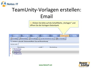 Das Dokument beschreibt, wie man in Teamunity eine neue Mailvorlage erstellt und vereinfacht das Arbeiten mit Vorlagen. Der Prozess umfasst das Öffnen der Vorlagen-Datenbank, das Erstellen einer Mailvorlage und das Festlegen von Eigenschaften wie Titel, Kategorien und Zustelloptionen. Abschließend werden die erforderlichen Felder definiert, um die Mailvorlage zu vervollständigen.
