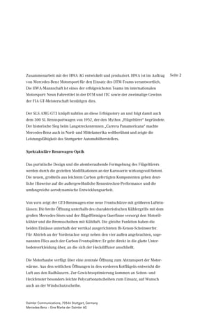 Der Mercedes-Benz SLS AMG GT3 ist eine Rennversion des SLS AMG, die auf das GT3-Reglement des FIA ausgelegt ist und für den Kundensport in Sprint- und Langstreckenrennen konzipiert wurde. Das Fahrzeug beeindruckt durch sein leichtes Design, hochentwickelte Aerodynamik und leistungsstarken 6,3-Liter-V8-Motor, der eine Höchstgeschwindigkeit von über 300 km/h erreichen kann. Die Auslieferung der Kundenfahrzeuge beginnt im Frühjahr 2011, nachdem die Homologation im März 2011 abgeschlossen sein wird.