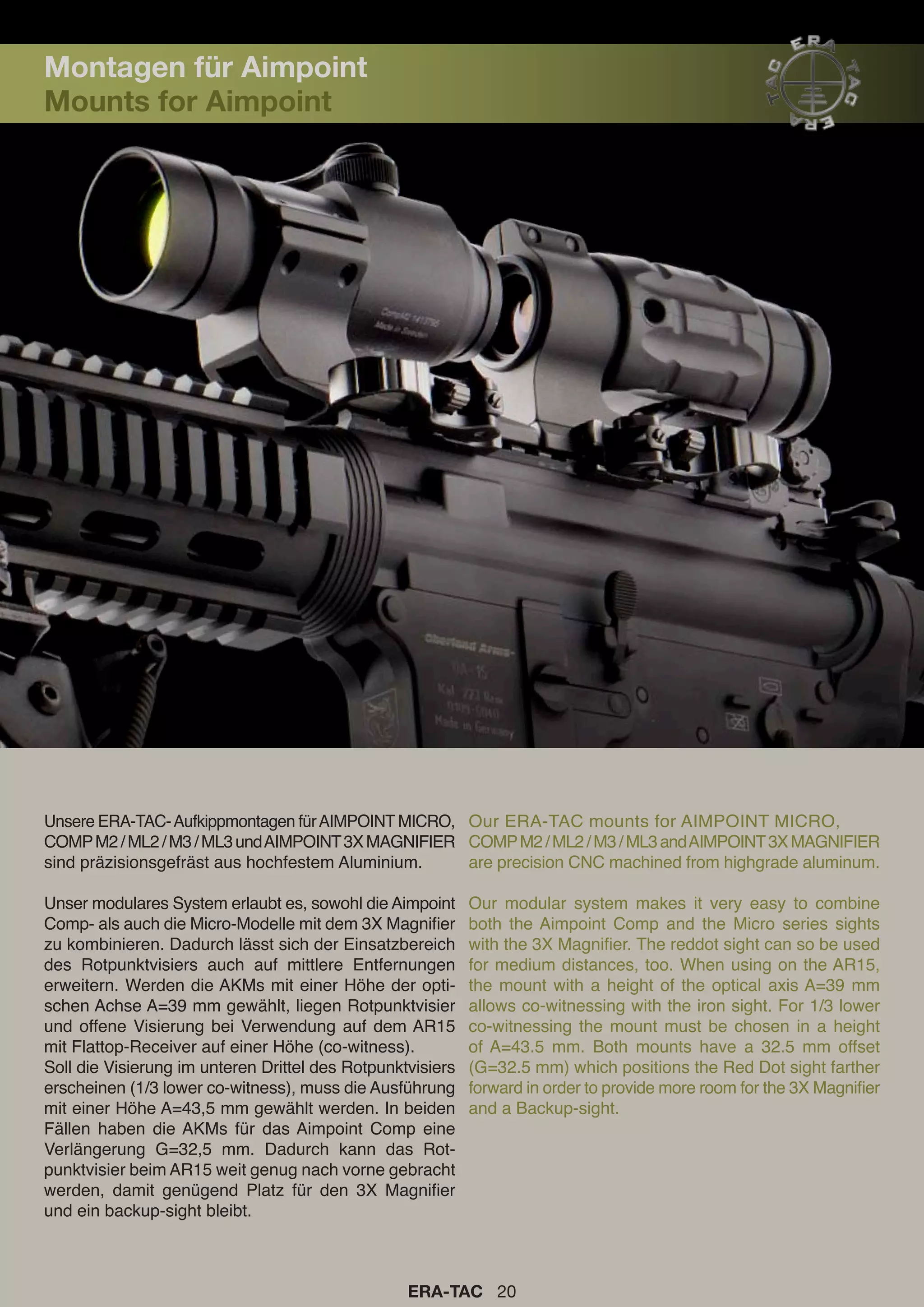 Die era-tac Aufkippmontagen für Aimpoint Mikro- und Comp-Modelle sind aus hochfestem Aluminium präzisionsgefräst und ermöglichen die Kombination mit einem 3x Magnifier, um den Einsatzbereich auf mittlere Entfernungen zu erweitern. Die Höhe der optischen Achse kann variiert werden, um eine Ko-Witnessing-Höhe von 39 mm oder 43,5 mm für verschiedene Visieroptionen zu erreichen. Darüber hinaus bieten die Montagen Platz für ausreichend Abstand zwischen dem Rotpunktvisier und einem Backup-Sichtgerät.