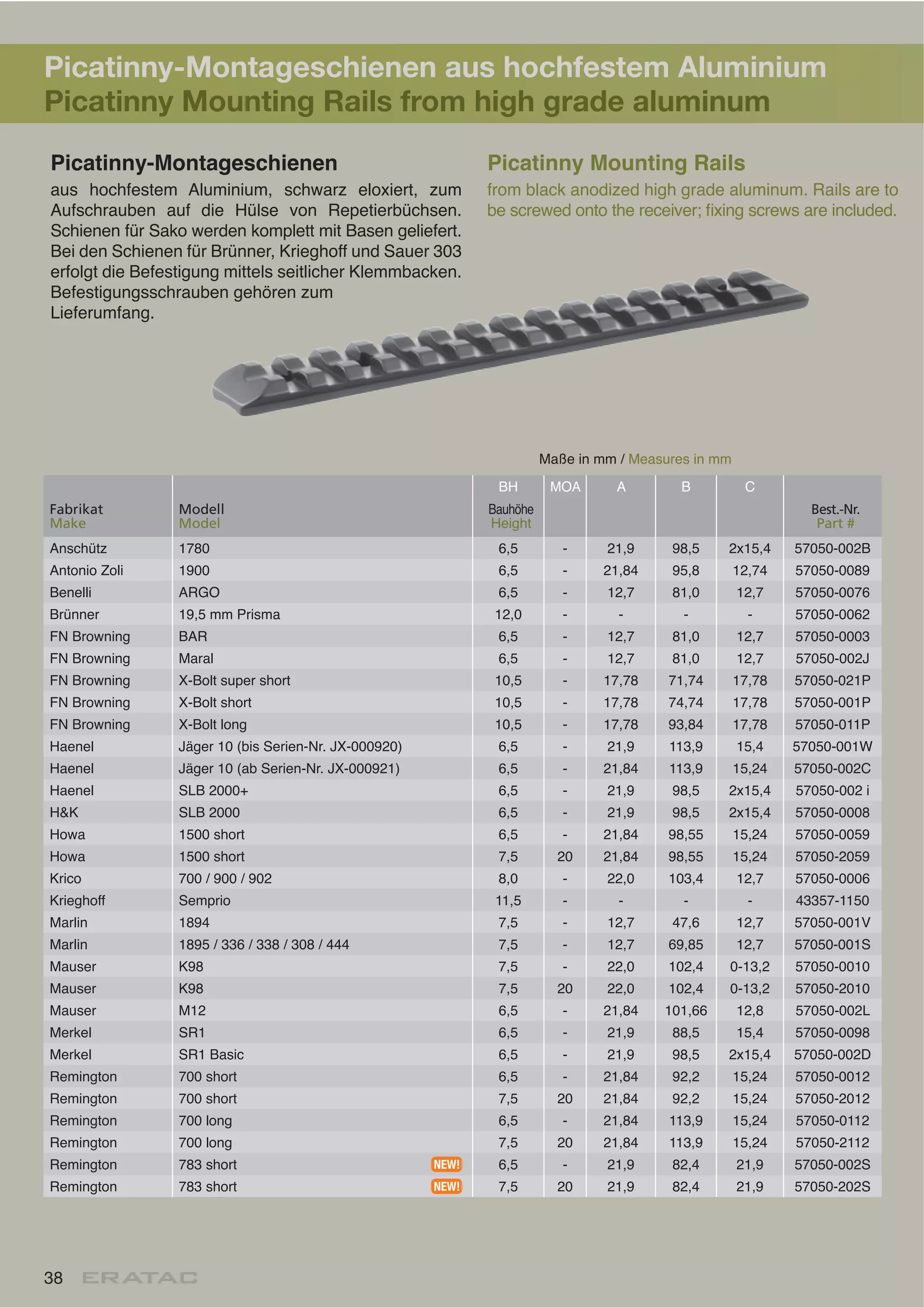 Das Dokument beschreibt verschiedene Montageschienen aus Aluminium und Stahl, insbesondere Picatinny-Montageschienen, die für verschiedene Waffenmodelle ausgelegt sind. Die Schienen sind in unterschiedlichen Konfigurationen erhältlich, einschließlich Befestigungen und Abmessungen, die spezifisch für bestimmte Waffenmodelle sind. Zudem werden die Bestellnummern und technischen Maße für zahlreiche Modelle aufgeführt.