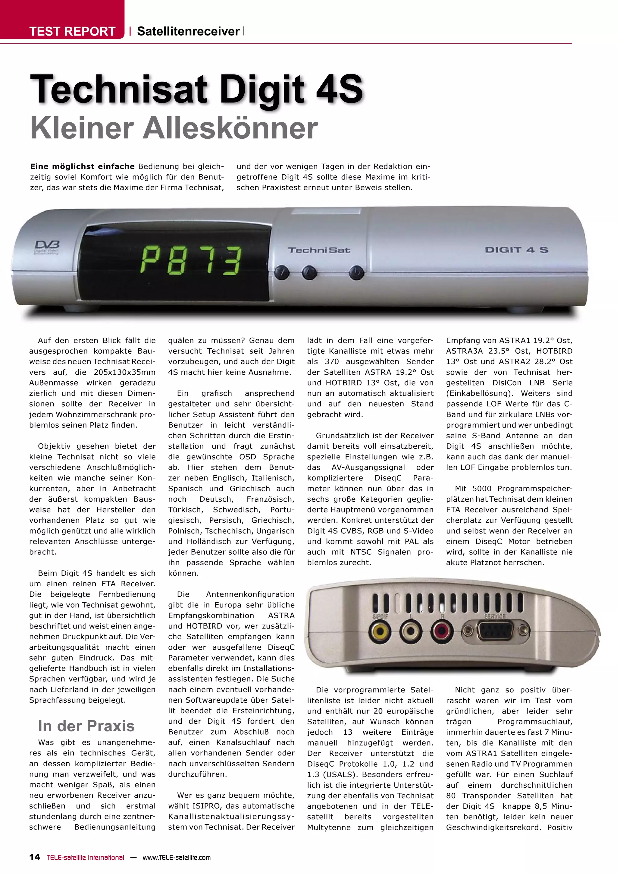 Der Technisat Digit 4S ist ein kompakter digitaler FTA-Satellitenreceiver, der benutzerfreundliche Bedienung und umfassende Funktionen bietet, darunter eine hohe Speicherkapazität von 5000 Programmen und Unterstützung für mehrere Sprachen. Der Receiver ermöglicht eine einfache Installation und bietet einen klaren Überblick über die Sender mit aktueller EPG-Information, hat jedoch eine nicht immer aktuelle vorprogrammierte Senderliste und benötigt Zeit für den Suchlauf. Trotz kleiner Mängel hebt sich das Gerät durch die übersichtliche Benutzeroberfläche und die hohe Empfangsqualität ab, was es auch für Neulinge im Umgang mit Satellitenempfang geeignet macht.