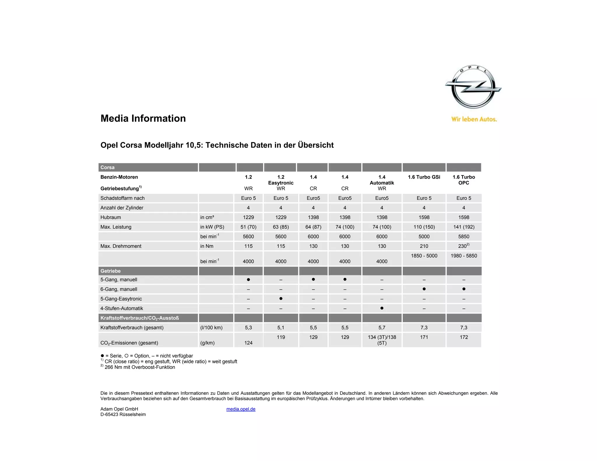 Der Pressetext bietet technische Informationen über das Opel Corsa Modell 10,5, einschließlich Motoren, Getriebe, Verbrauch und CO2-Emissionen für verschiedene Benzin- und Dieselvarianten. Die angegebenen Werte gelten für Deutschland und könnten in anderen Ländern abweichen. Es wird darauf hingewiesen, dass Änderungen und Irrtümer vorbehalten sind.