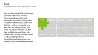 Das Technology Center Leipzig fokussiert sich auf eine Vielzahl von Bereichen, darunter Cloud, Datenmanagement, Cyber Defense, Finanztransformation und Human Capital. Es unterstützt Kunden dabei, innovative IT-Lösungen zu entwickeln, die digitale Transformation voranzutreiben und zukunftsfähige Geschäftsmodelle zu sichern. Zudem bietet das Center Schulungen und Expertise in SAP-Transformationen sowie in der Implementierung modernster Technologien wie ServiceNow an.