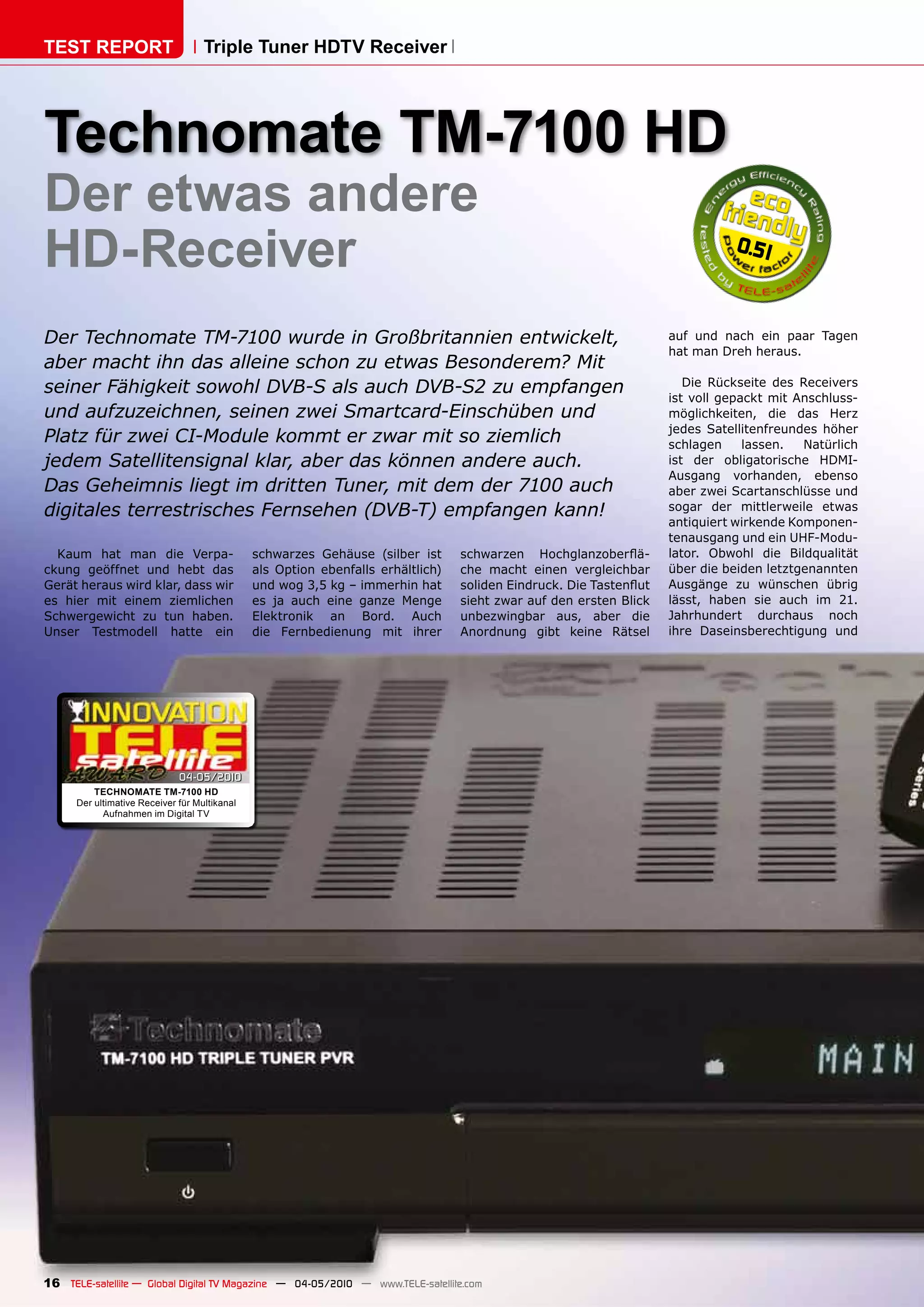 Der Technomate TM-7100 HD ist ein vielseitiger HD-Satelliten-Receiver, der DVB-S und DVB-S2 empfangen kann und über zahlreiche Anschlussmöglichkeiten verfügt, darunter zwei Smartcard-Einschübe und HDMI-Ausgang. Mit seiner Fähigkeit, sowohl Satelliten- als auch terrestrisches Fernsehen zu empfangen, sowie einer komfortablen Benutzeroberfläche und Funktionen wie Timeshift und EPG ist das Gerät besonders benutzerfreundlich. Dank der Möglichkeit, bis zu drei Programme gleichzeitig aufzuzeichnen, und der umfangreichen Kapazität für externe Speicherlösungen richtet sich der Receiver an anspruchsvolle Nutzer und Fernsehjunkies.