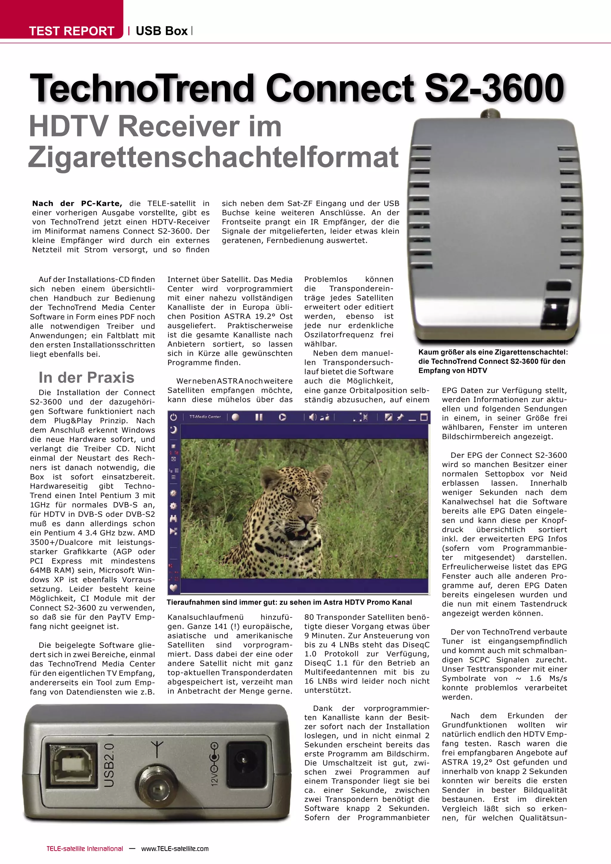 Der Technotrend Connect S2-3600 ist ein kompakter HDTV-Empfänger im Zigarettenschachtelformat, der über eine benutzerfreundliche Software und umfangreiche EPG-Funktionalitäten verfügt. Mit der Box können bis zu 141 Satellitenprogramme empfangen werden, inklusive der Möglichkeit, HD- und SD-Programme flüssig darzustellen. Obwohl gewisse Einschränkungen bezüglich CI-Modulen bestehen, bietet die Box eine kostengünstige Alternative zu herkömmlichen HDTV-Settop-Boxen und unterstützt vielfältige Mediaplayer-Anwendungen.