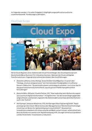 Die Techweek 2019 in Frankfurt präsentierte verschiedene Themenbereiche, darunter Cloud, DevOps, Cybersecurity und IoT, und zog ein internationales Publikum an. Die Veranstaltung betonte die Bedeutung von Digitalisierung und innovativen Technologien für Unternehmen, während Experten über strategische Herausforderungen und Lösungen berichteten. Besondere Schwerpunkte lagen auf der Notwendigkeit flexibler Technologielösungen, Governance-Strukturen und der schnellen Umsetzung von Prototypen zur Minimierung von Risiken.