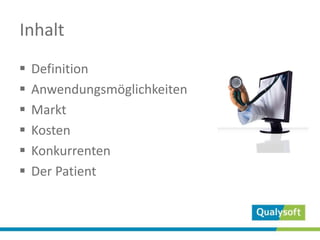 Telehealth nutzt Telekommunikation zur Patientenüberwachung und ermöglicht die Einbeziehung von Spezialisten durch die Sammlung medizinischer Daten. Es bietet Vorteile für Hausärzte, chronisch Kranke und Spezialisten, während es auf einen stark wachsenden Markt mit einer prognostizierten Wachstumsrate von 2000-6000% in den nächsten 10 Jahren zielt. Kostenersparnisse pro Patient betragen etwa 200 $ und Investitionen sind auf 10.000 $ geschätzt, mit einer Amortisationszeit von 3-6 Monaten.