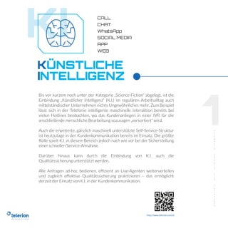 Das Dokument beschreibt eine integrierte Plattform zur Nutzung von Künstlicher Intelligenz (K.I.) in der Kundenkommunikation, die multichannel- und omnichannel-Interaktionen ermöglicht. Telerion bietet eine Lösung, die alle Kommunikationskanäle vereint und individuelle Konfigurationsmöglichkeiten für das Routing und die Qualitätssicherung integriert, sowie eine benutzerfreundliche Oberfläche für Agenten. Darüber hinaus wird auf die Flexibilität der Systemanbindung und die Nutzung von WebRTC für sichere direkte Kommunikation hingewiesen.
