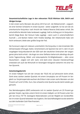 Der Halbjahresfinanzbericht der Teles AG zeigt einen Umsatzanstieg von 3 % auf 5,9 Millionen Euro für das erste Halbjahr 2014, jedoch sank der Rohertrag um 7 % und das EBIT fiel um 34 % im Vergleich zum Vorjahr. Die Unternehmenskennzahlen sind durch höhere Materialkosten und den Wegfall von Sondereffekten belastet. Teles erwartet für die zweite Jahreshälfte ein Umsatzplus und eine Verbesserung der Ertragslage, abhängig von Erfolgen im US-Markt.