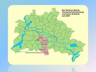 Der Bezirk Tempelhof-Schöneberg entstand 2001 aus der Fusion der Bezirke Tempelhof und Schöneberg und hat eine Fläche von etwa 53,1 km² sowie ca. 335.966 Einwohner. Historische Ereignisse umfassen die berühmte Rede von John F. Kennedy am Rathaus Schöneberg 1963 und die Errichtung des Luftbrückendenkmals 1951, das an die Luftbrücke 1948/1949 erinnert. Wichtige Plätze im Bezirk sind der Viktoria-Luise-Platz und der Wittenbergplatz, die beide bedeutende Denkmal- und Verkehrsknotenpunkte darstellen.