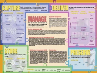 Das Dokument behandelt die Vision und Potentiale des Enterprise Content Management (ECM), das als Strategie zur Erfassung, Verwaltung und Archivierung von Unternehmensinhalten verstanden wird. Es werden verschiedene Komponenten und Trends innerhalb des ECM-Marktes diskutiert, sowie die Herausforderungen und Entwicklungen bei der Verwaltung unstrukturierter Daten. Der Fokus liegt auf der Notwendigkeit, ECM-Technologien einzuführen, um die Informationsflut effizient zu bewältigen und die Wettbewerbsfähigkeit zu steigern.