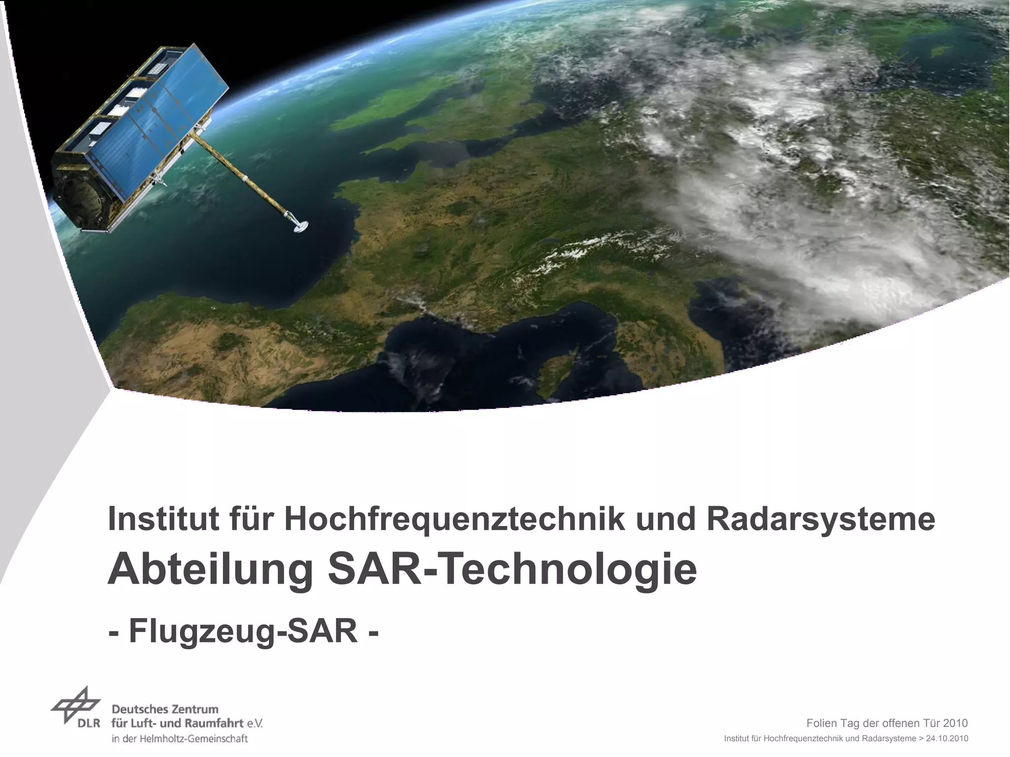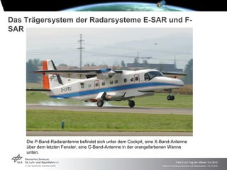 Das Dokument beschreibt die Technologien und Systeme des Instituts für Hochfrequenztechnik und Radarsysteme, die im Jahr 2010 beim Tag der offenen Tür vorgestellt wurden. Es umfasst Informationen über verschiedene Radarantenne-Systeme, deren Anordnung im Flugzeug sowie erfolgreiche Einsatzbeispiele des F-SAR-Systems, einschließlich der Signalqualität und Auflösungen. Zudem werden Anwendungen in der Landwirtschaft und Umwelterforschung thematisiert, zusammen mit Ergebnissen von SAR-Interferometrie zur Höhenmodellakquisition.