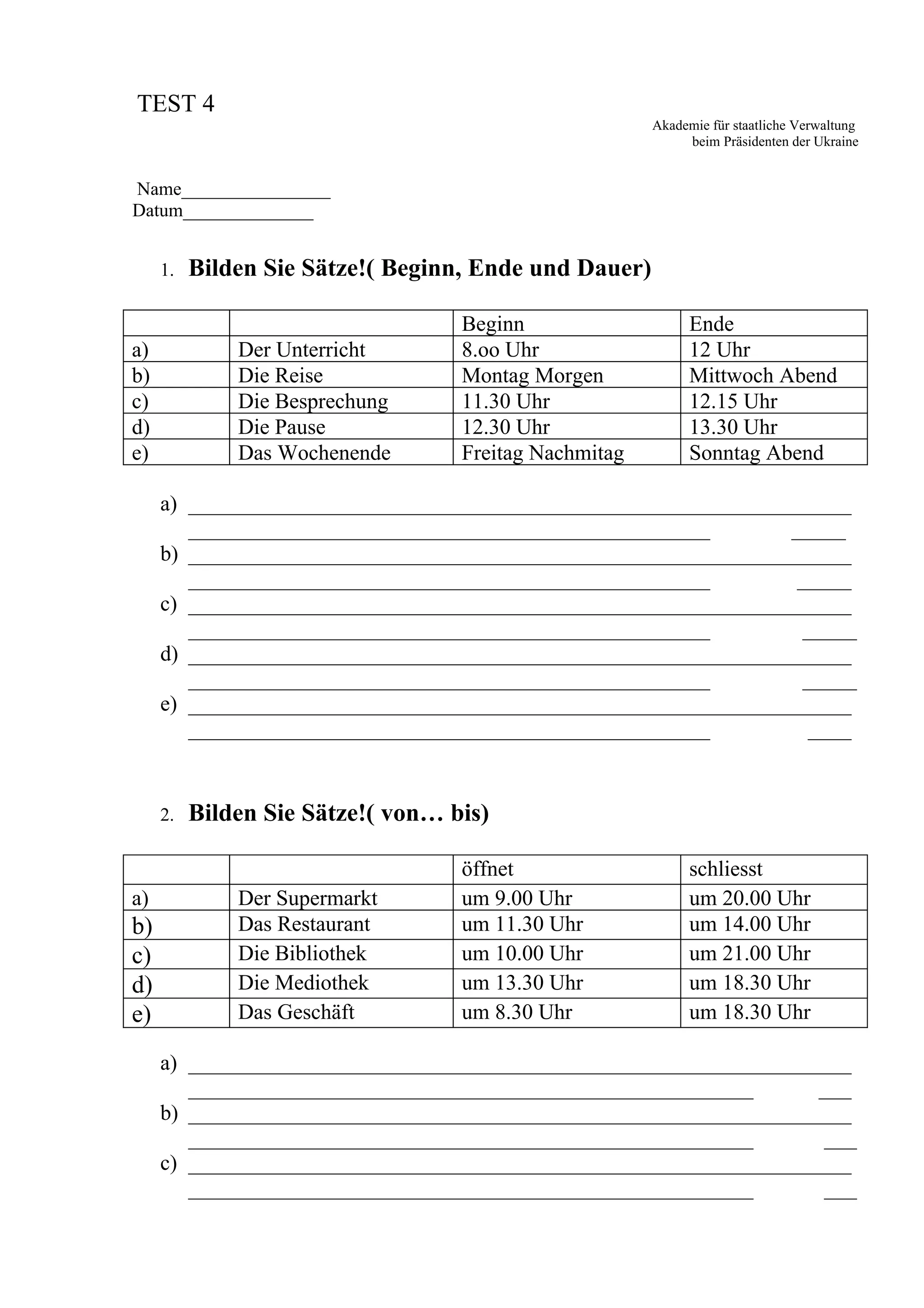 Das Dokument enthält Übungen zur Bildung von Sätzen in deutscher Sprache, die sich mit zeitlichen Abläufen, Öffnungszeiten und Besuchen von Orten befassen. Es umfasst konkrete Beispiele, in denen die Nutzer Wörter wie Sprechstunde, Bibliothek und Hotel in vollständige Sätze einfügen sollen. Ziel ist es, den Umgang mit Zeitangaben und alltäglichen Aktivitäten zu trainieren.