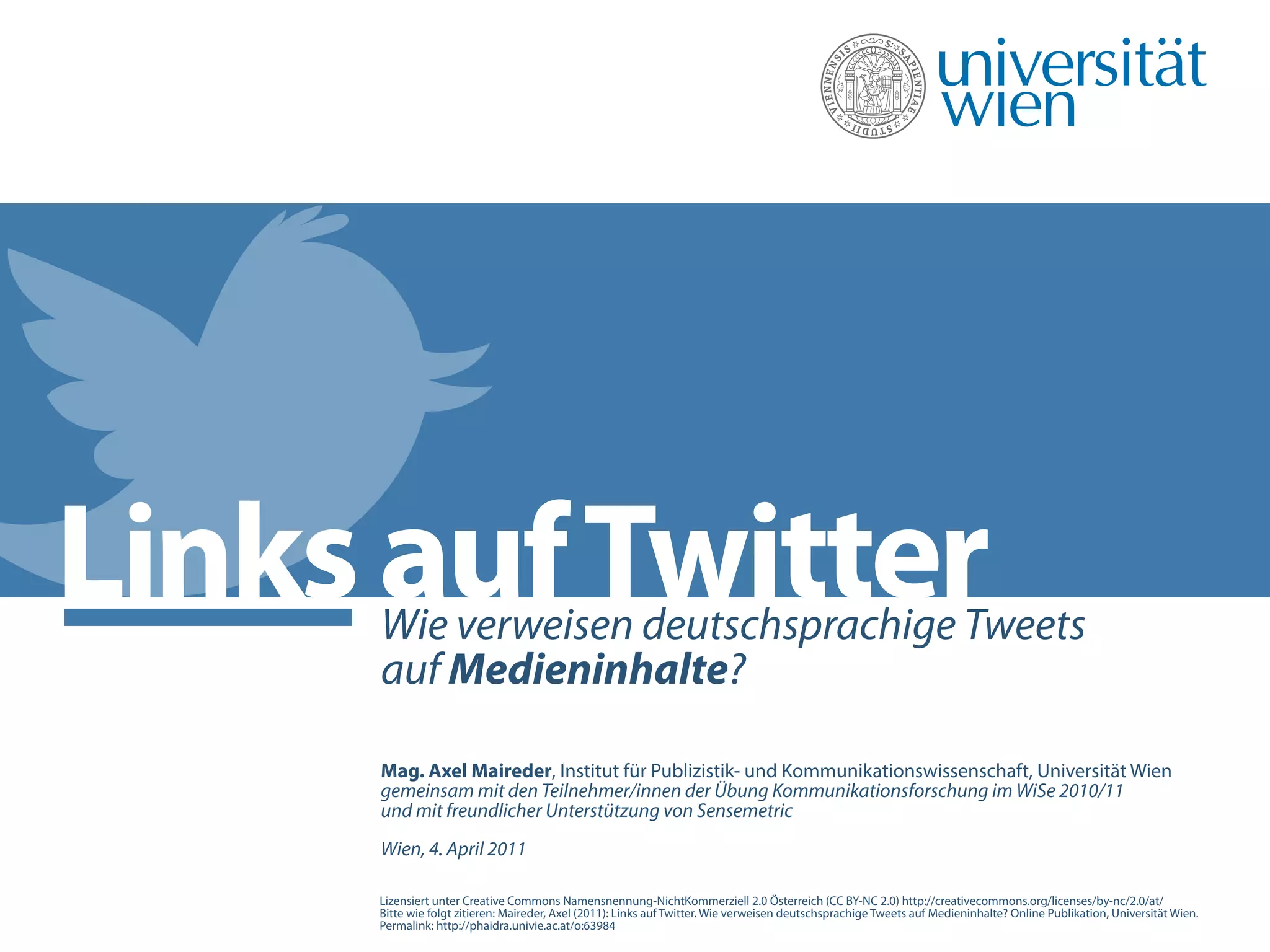Die Studie untersucht, wie deutschsprachige Tweets auf Medieninhalte verweisen, und kommt zu dem Ergebnis, dass 34% der Links zu redaktionellen Medien führen und 28% zu Unternehmen oder Organisationen. Zudem sind 27% der Tweets von individuellen Nutzern und 55% werden durch persönliche Kommentare begleitet, wobei häufig auf die Titel der Inhalte verwiesen wird. Die Analyse basiert auf einer quantitativen Inhaltsanalyse von 3.221 Tweets, die von als Individuen erkennbaren Nutzern stammen.
