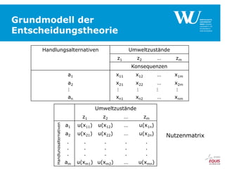 Das Dokument behandelt die Theorie der Entscheidung unter Berücksichtigung partieller Informationen, einschließlich der Handlungsalternativen, Umweltzustände und der Konsequenzen für verschiedene Entscheidungsmodelle. Es werden verschiedene Informationssysteme sowie das Bayes'sche Theorem zur Informationsbeschaffung vorgestellt und diskutiert, wie Kosten für Suche und Tests die optimale Entscheidungsstrategie beeinflussen. Tabellen zeigen die Auswirkungen von Such- und Testkosten sowie der Verteilung der Entscheidungsparameter auf die optimale Entscheidungsstrategie.