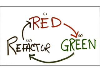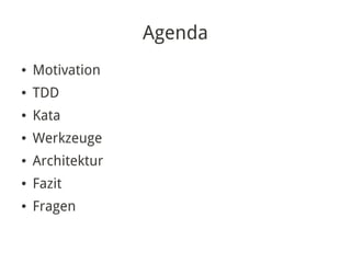 Das Dokument behandelt die testgetriebene Entwicklung (TDD) mit JavaScript und präsentiert eine Agenda, die Motivation, TDD-Regeln, Werkzeugempfehlungen und Architekturansätze umfasst. Es betont die Wichtigkeit, Fehler frühzeitig zu erkennen und zu beheben, sowie verschiedene Testwerkzeuge wie Jasmine und QUnit vorzustellen. Der Schlussfolgerung zufolge ist TDD mit JavaScript umsetzbar und es gibt Raum für weitere Katas zur Vertiefung des Wissens.