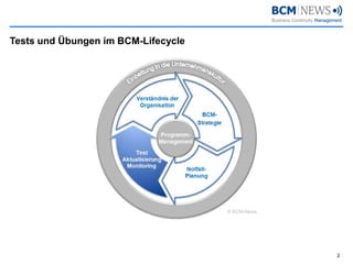 Das Dokument gibt einen Überblick über Tests und Übungen im BCM-Lifecycle, die darauf abzielen, die Funktionsfähigkeit von BCM-Strategien und -Plänen zu gewährleisten und die beteiligten Personen in ihren Rollen zu trainieren. Es werden verschiedene Arten von Tests und Übungen vorgestellt, wie z.B. Gebäude- und Alarmierungsübungen sowie Krisenstabsübungen, und notwendige Dokumentationen, die für die Planung und Durchführung erforderlich sind, erläutert. Zudem wird der Prozess der Übungsziele und -planung sowie die Durchführung und Auswertung der Übungen behandelt.