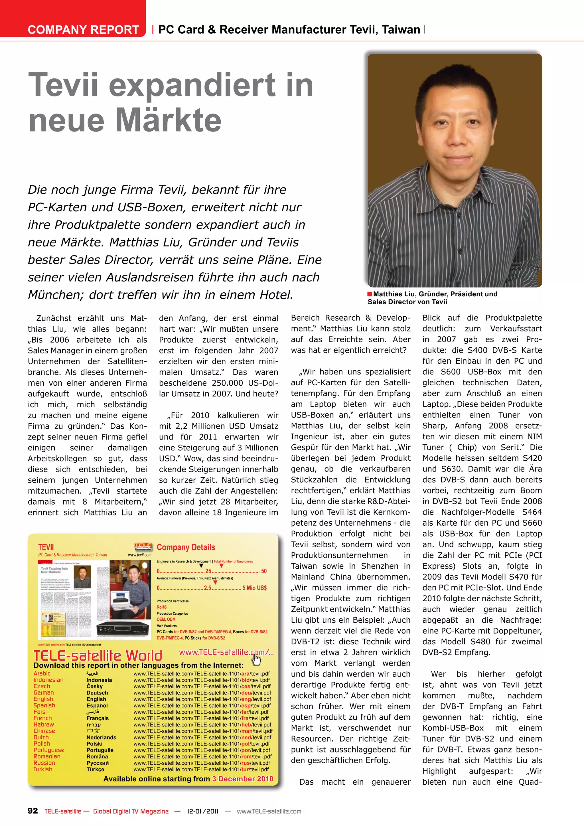 Tevii, ein taiwanesischer Hersteller von PC-Karten und USB-Boxen, erweitert seine Produktpalette und tritt in neue Märkte ein, mit dem Ziel, bis 2011 einen Umsatz von 3 Millionen USD zu erreichen. Der Gründer Matthias Liu blickt auf eine beeindruckende Entwicklung des Unternehmens, das mit innovativen DVB-S/S2-Produkten überzeugt und künftig auch DVB-C-Lösungen sowie Receiver auf den Markt bringen möchte. Tevii plant auch eine Expansion in asiatische und südamerikanische Märkte, während sich 40% der Verkäufe auf Europa konzentrieren.