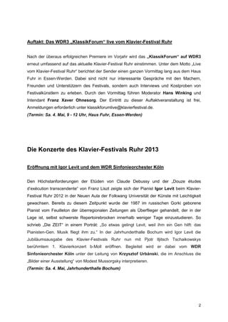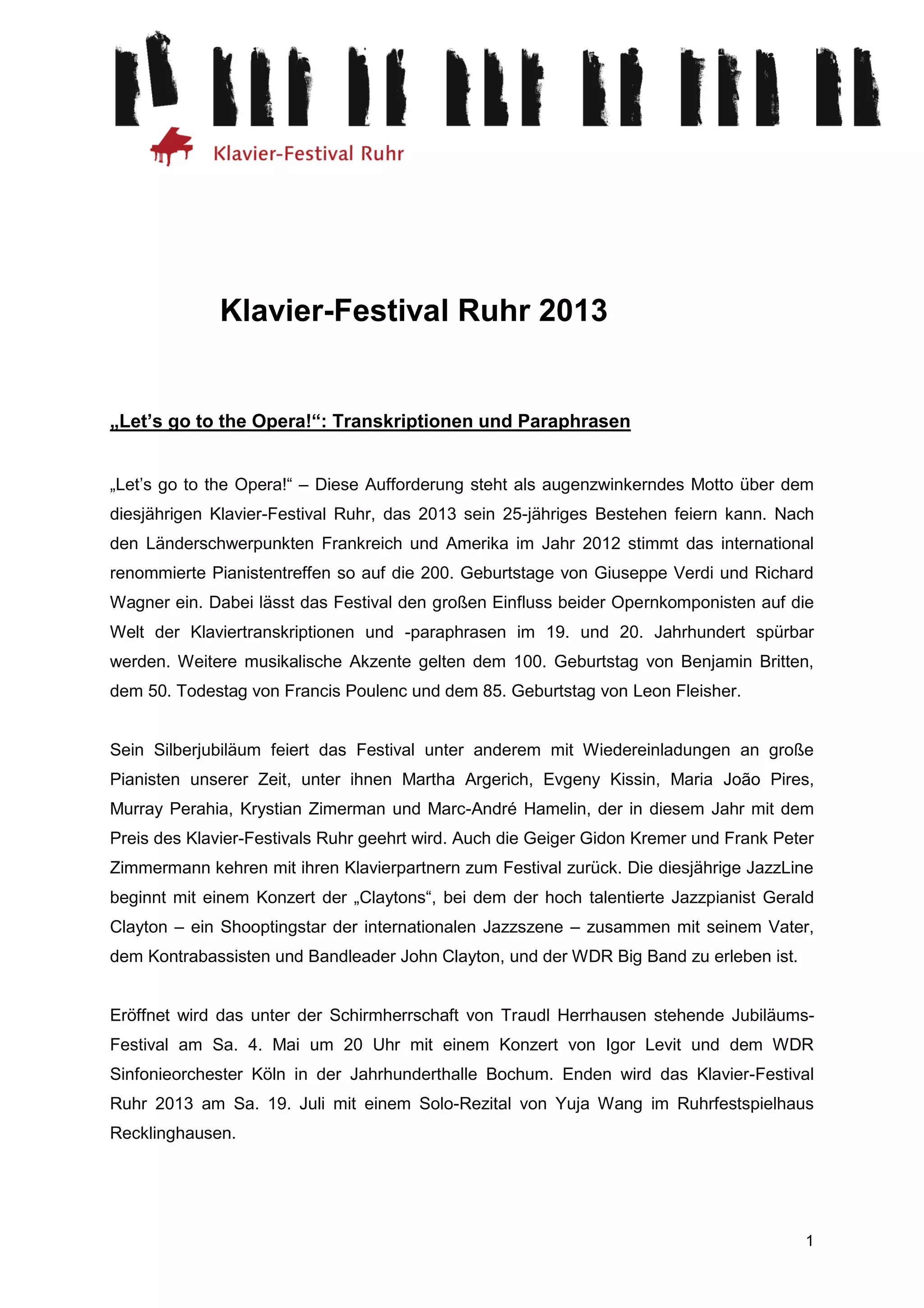 Das Klavier-Festival Ruhr 2013 unter dem Motto 'Let's Go to the Opera!' feiert sein 25-jähriges Bestehen und würdigt die 200. Geburtstage von Giuseppe Verdi und Richard Wagner durch verschiedene Konzerte und Transkriptionen. Zu den Höhepunkten zählen Auftritte namhafter Pianisten wie Igor Levit, Martha Argerich und Evgeny Kissin, während auch zeitgenössische Künstler und Jazzkonzerte Teil des Programms sind. Das Festival beginnt am 4. Mai mit einem Eröffnungskonzert und endet am 19. Juli mit einem Solo-Rezital von Yuja Wang.