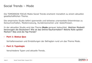 Die Studie untersucht das Modebewusstsein und das Kaufverhalten der Deutschen, wobei 50% der Befragten modisch gekleidet sein möchten und Männer oft auf den Rat ihrer Partnerinnen hören. Zudem zeigt die Analyse, dass der Online-Einkauf besonders bei jüngeren Verbrauchern beliebt ist, während Markenbewusstsein als weniger wichtig erachtet wird. Die Ergebnisse basieren auf einer Panelbefragung von 550 Teilnehmern und beleuchten relevante Aspekte wie Marketing, Konsumverhalten und aktuelle Modetrends.