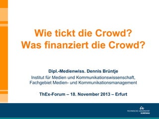 Die Präsentation von Dennis Brüntje behandelt das Thema Crowdfunding und speziell Crowdinvesting, einschließlich seiner Funktionsweise, Abgrenzung zu verschiedenen Plattformen und Erfolgsfaktoren. Der Fokus liegt auf den Motivationen von Unterstützern und Investoren sowie Best Practices und Erfolgsbeispielen aus der Branche. Dabei werden unterschiedliche Plattformsstrukturen und die Rolle der Plattformen als Intermediäre in diesem Finanzierungsmodell hervorgehoben.