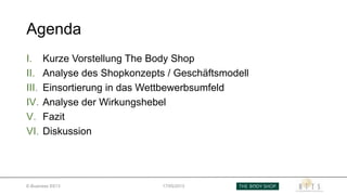 Das Dokument analysiert das Geschäftsmodell von The Body Shop, das sich auf ethische Grundsätze wie Tierschutz und Fairen Handel konzentriert und einen Umsatz von 1,4 Milliarden Euro erzielt. Die Zielgruppe sind umweltbewusste Frauen zwischen 20 und 50 Jahren, die Wert auf Nachhaltigkeit und Transparenz legen. Die SWOT-Analyse identifiziert Stärken wie hohe Produktqualität, aber auch Schwächen im Bereich Marketing und Wettbewerbssituation.