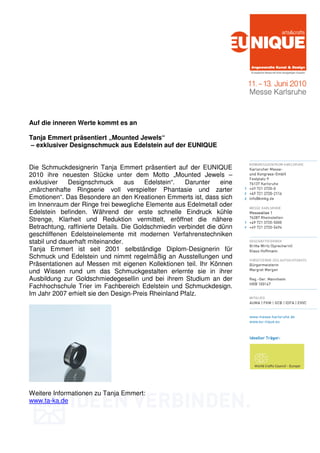 Das Dokument beschreibt verschiedene Designer und deren Werke, die auf der Eunique 2010 präsentiert werden. Dazu gehören die handgefertigten und nachhaltigen Senger Tierpuppen, der exklusive Designschmuck von Tanja Emmert mit beweglichen Edelstein-Elementen sowie die individuellen Textilgestaltungen von Keskusta und die keramischen Lichtobjekte von Manfred Braun, die rituelle Aspekte in den Alltag integrieren. Diese Künstler und Designer setzen auf hohe Qualität, Kreativität und ökologische Verantwortung in ihren Arbeiten.