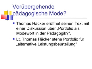Thomas Häcker diskutiert die Rolle von Portfolios als Instrument für alternative Leistungsbeurteilungen in der Bildung, das Kommunikation, Transparenz und Partizipation fördert. Portfolios ermöglichen eine reflexive Lernprozesssteuerung und individuelle Leistungsbeurteilung, stellen jedoch auch Herausforderungen dar, da sie oft zu individueller Haftung der Lernenden führen können und nicht immer die Lernbedingungen berücksichtigen. Häcker betont die Notwendigkeit einer Reform der Lehr- und Lernkultur, um die Beurteilung der eigenen Leistungen als bedeutende Herausforderung der Unterrichtsentwicklung anzugehen.