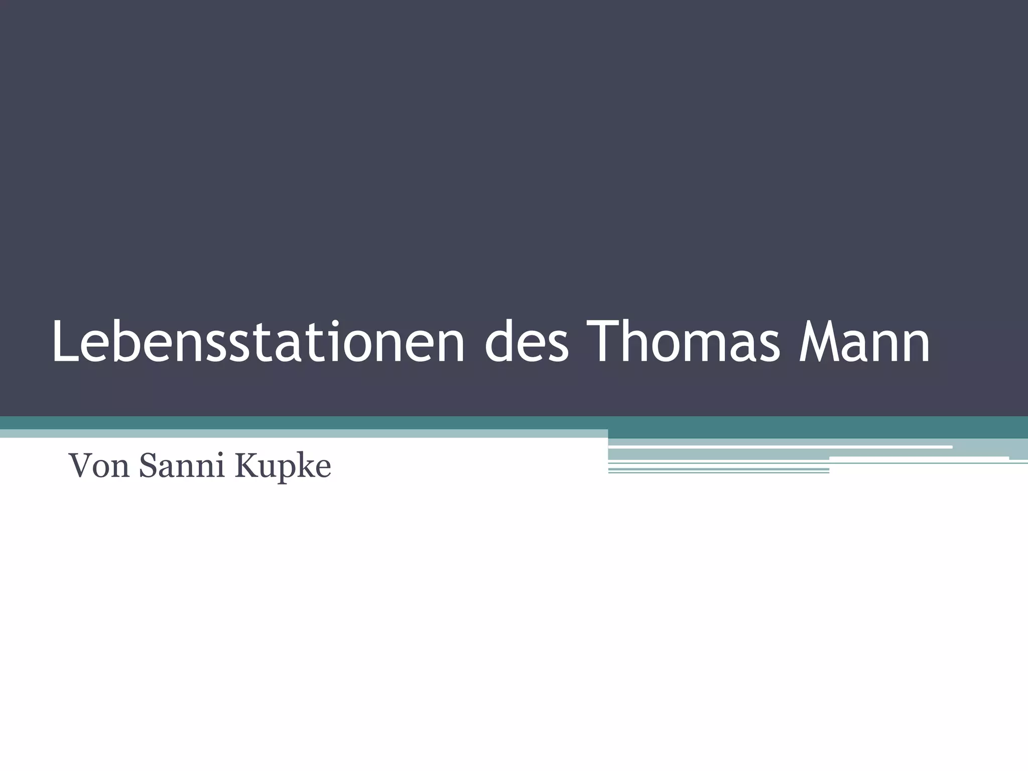 Das Dokument behandelt das Leben des Schriftstellers Thomas Mann in verschiedenen Lebensabschnitten: seine Kindheit und Jugend in Lübeck, seine Zeit im Exil während des Nationalsozialismus sowie seine Rückkehr nach Deutschland und die letzten Jahre seines Lebens. Es beleuchtet sowohl seine familiäre Herkunft als auch seine literarischen Werke und politischen Ansichten. Zudem werden wichtige persönliche Ereignisse und gesellschaftliche Entwicklungen sein Leben prägten, thematisiert.