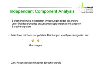 Das Dokument behandelt die Aktivitäten des Instituts zur Signaltrennung, insbesondere durch interne Komponentenanalysen (ICA) und Zeit-Frequenzmaskierung zur robusten Spracherkennung. Es wird erläutert, wie diese Methoden zur Rekonstruktion und Trennung von Sprachsignalen in gestörten Umgebungen verwendet werden können, sowie deren Auswirkungen auf die Signalqualität und Erkennung. Zudem wird die Anwendung von Missing-Data-Techniken zur Verbesserung der Spracherkennung in Verbindung mit ICA hervorgehoben.
