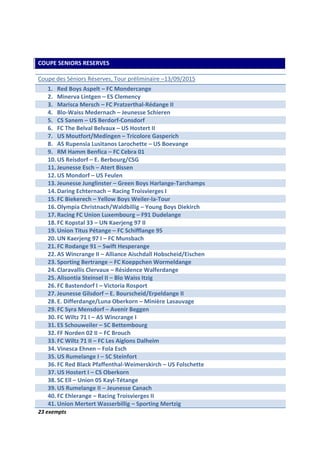 Das Dokument listet die Auslosungen und Spiele der Loterie Nationale Coupe de Luxembourg und anderer Turniere für verschiedene Fußballmannschaften in Luxemburg, die in mehreren Runden zwischen August und September 2015 stattfinden. Es enthält spezifische Informationen über die teilnehmenden Teams und die geplanten Begegnungen. Darüber hinaus werden die Exempten in den verschiedenen Wettbewerben aufgeführt.